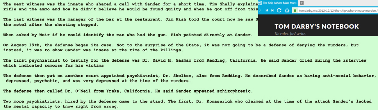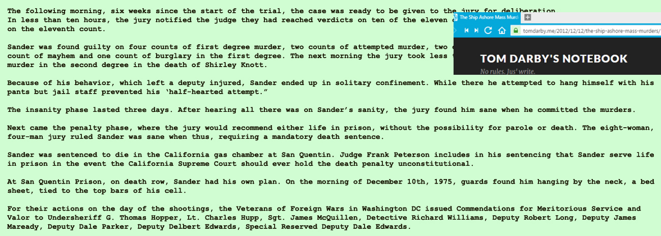 The more I think about it I think that Kathy's ride-mate's destination was somewhere in L.A. or possibly the 'O.C.' at least that's what I was told by Kathy. -- After the firey and violently bloody events that were to then soon to take place during 'Callahan Days' that following weekend of July 25th through July 26th, I didn't believe anything that Karen or Kathy had told me about the supposed reasons for Kathy's visit or how Kathy may have arrived in Yreka on Sunday July 20, 1975. -- For all I know this arrival date may have been a lie as well under the circumstances.