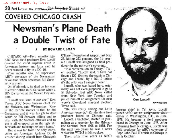 All this just in time for the Mexican 'Day of the Dead' festivities on the following day on November 1,1979. One of the passengers from the Halloween '79 Western DC-10 flight from LAX that crashed into a 10 ton water truck conveniently parked on the runway at Juarez International in Mexico City was Ken Lucoff, Bill Stewart's ABC television producer who also reportedly died in the crash.