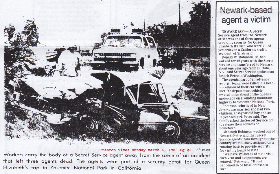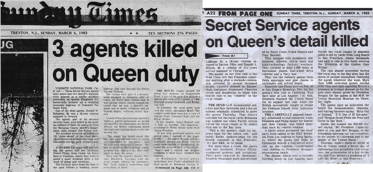 The three U.S. Secret Service agents were all part of the massive security detail assigned to protect Queen Elizabeth and Prince Philip during their March 1983 visit to California other points west.